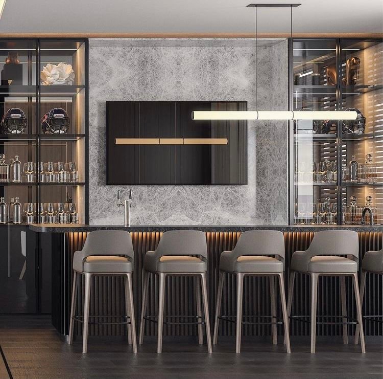 This personalized bar was designed to meet the homeowner's specific needs and style preferences. Custom cabinetry provides ample storage for glassware, liquor, and bar tools, while the built-in wine cooler keeps bottles at the perfect temperature. The bar's design includes a mix of open and closed storage, with a stunning stone countertop and modern lighting to complete the look.